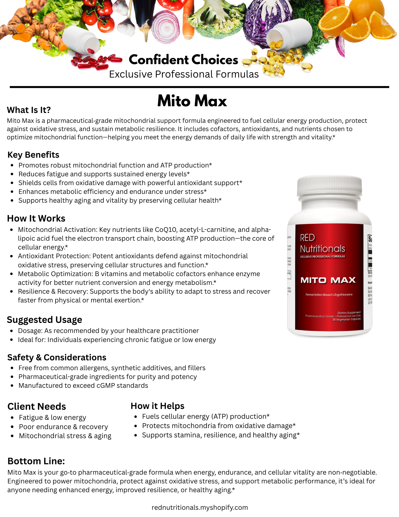 Mito Max features the concentrated form of the histone derivative L-ergothioneine produced via a proprietary fermentation-based method. Through its antioxidant and cytoprotectant mechanisms, L-ergothioneine combats oxidative stress throughout the body and provides multiple health benefits.